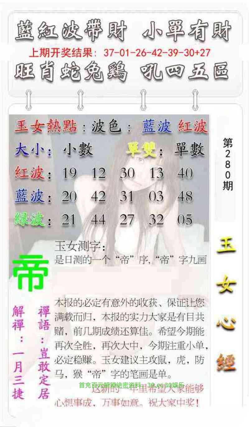 280期澳门彩票中心开鼠42 波色:绿波蓝波 尾数:6428930尾 生肖:龙鸡牛鼠羊猴猪蛇兔 |